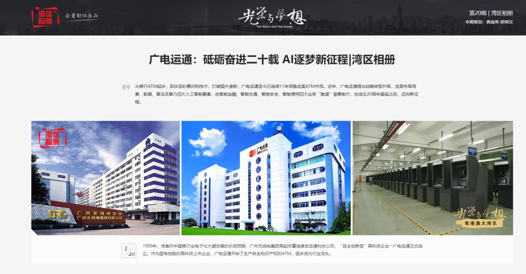 从银行ATM起步,到攻坚钞票识别技术,打破国外垄断,广电运通至今已连续11年领跑全国ATM市场。近年,广电运通提出战略转型升级,全面布局场景、数据、算法及算力四大人工智能要素,在智能金融、智能交通、智能安全、智能便民四大业务“跑道”奋勇前行,在成立20周年盛诞之际,全景网展示大湾区优秀企业风采的栏目——《湾区相册》,以超清视觉让大众对广电运通有更直观、感性的认识,展现出大湾区企业的璀璨星光。