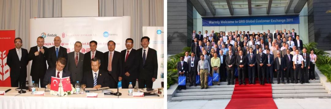 2011年4月,广电运通全资子公司运通国际与土耳其农业银行正式签订总金额约合2.3亿元的存取款一体机合同,极大推动我国ATM循环机芯自主核心技术产业化发展(图左)。同年,广电运通ATM顺利通过了全部2200多项测试,获得由德国银行业委员会授予的“德国ATM系统认证”,为进军全球发达国家市场奠定了牢固基础。在当年的全球客户交流大会,广电运通面向全球发布全新的品牌理念“We Move Faster”(图右)。