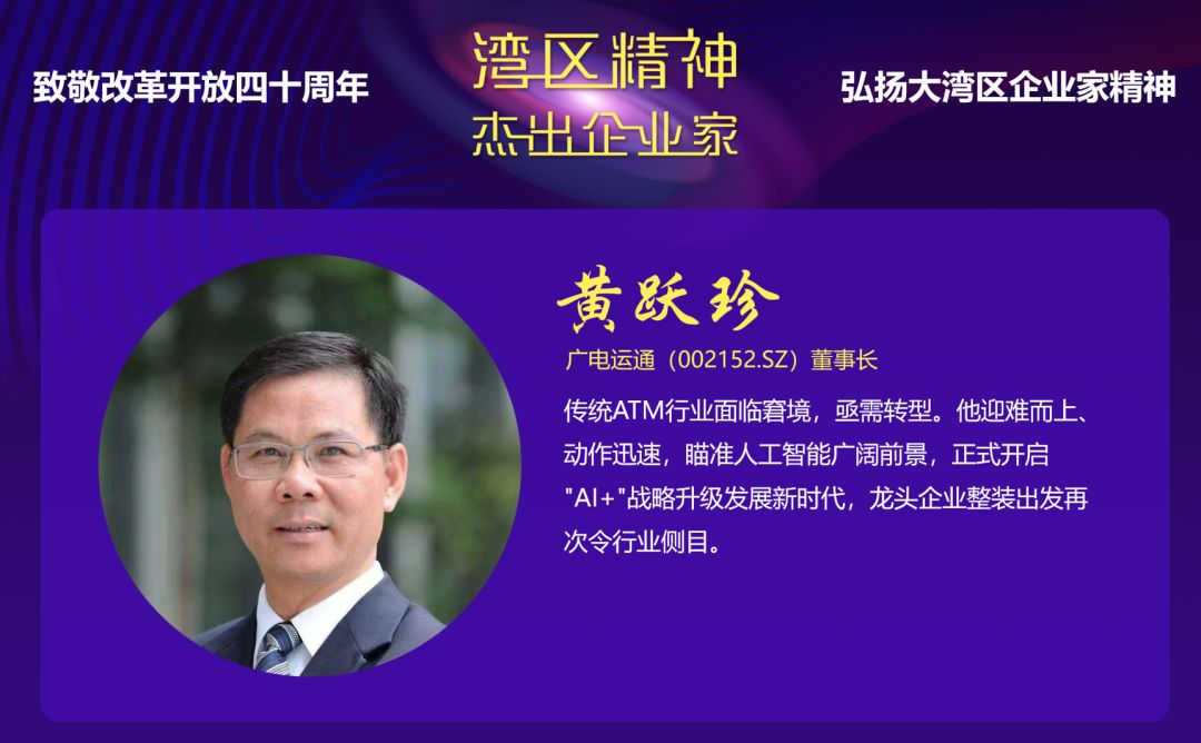 2018年12月17日,“光荣与梦想——2018粤港澳大湾区上市公司发展机遇论坛”在深圳成功举行。论坛发布了“湾区精神杰出企业家”致敬名单,对粤港澳大湾区发展做出杰出贡献的企业家们进行表彰。作为中国企业领军者,广电运通董事长黄跃珍获此殊荣。
