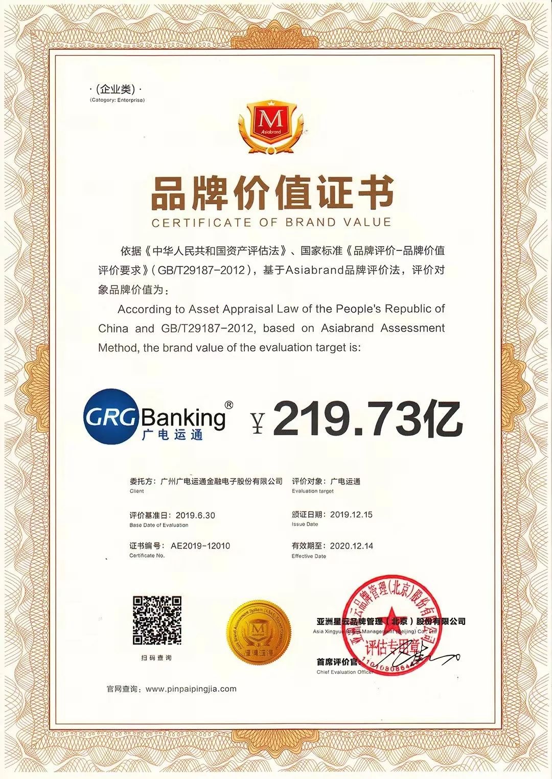 12月15日,由《经济》杂志社、《环球时报》社、中国亚洲经济发展协会联合举办的 “2019中国经济高峰论坛”在京举行。作为本次大会重要的学术成果,亚洲品牌研究院发布了“2019中国上市公司品牌500强”榜单,广电运通以219.73亿的品牌价值位列198位。