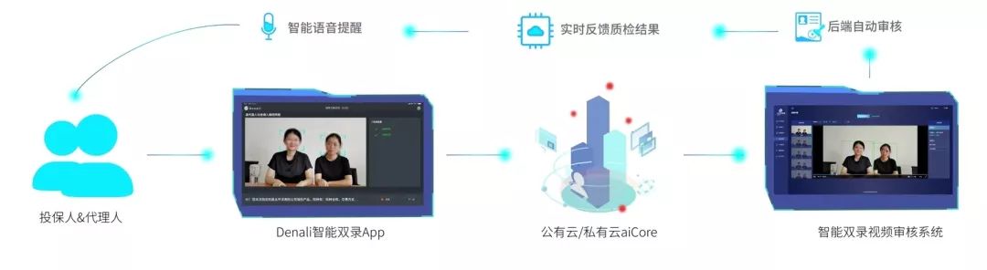 以某保险销售场景为例,投保人与代理人通过Deanli智能双录app进行视频双录,在双录过程中,APP提供规范的双录指导,对检测异常信息实时提醒;同时后端通过视频质检系统对已录制的视频进行自动质检,能够第一时间发现问题,及时告知客户及业务人员进行补录,提升客户体验。通过事中检测的双录通过率可达到90%以上。而视频录制完成后,再经过后台算法复核、人工终审,可保证每一单保险的合法合规,杜绝风险。同时基于aiCore平台本身对海量数据的处理能力,保险公司能够有效地对海量视频进行存储、检索及管理。