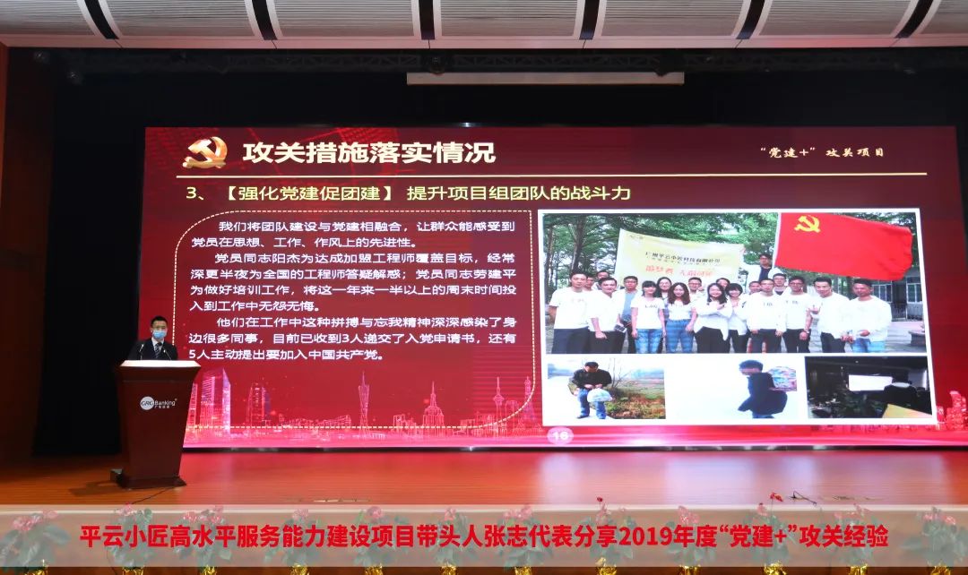 集团党委副书记梁玉琴为公司2018-2019年度优秀“党建+”攻关项目颁奖会议指出,2019年以来,在集团党委的领导下,公司党委紧紧围绕”强基础、提质量、树品牌“的党建主题,紧扣公司年度生产经营重点,积极开展“党建+”攻关项目活动,扎实推动党建与业务深度融合,精选出18个攻关项目先行先试,公司各级党组织和党员干部纷纷立足岗位实际,制定有效计划,分解工作任务,以实际行动围绕生产经营攻关排难、破解难题,取得一定成效,通过了项目验收,进一步发挥了党支部的堡垒作用和党员先锋模范作用,实现了党建工作与生产经营同频共振、融合发展。其中荣获集团2019年“党建+”攻关项目二等奖的平云小匠党支部高水平服务能力建设项目带头人张志代表分享2019年度“党建+”攻关经验。