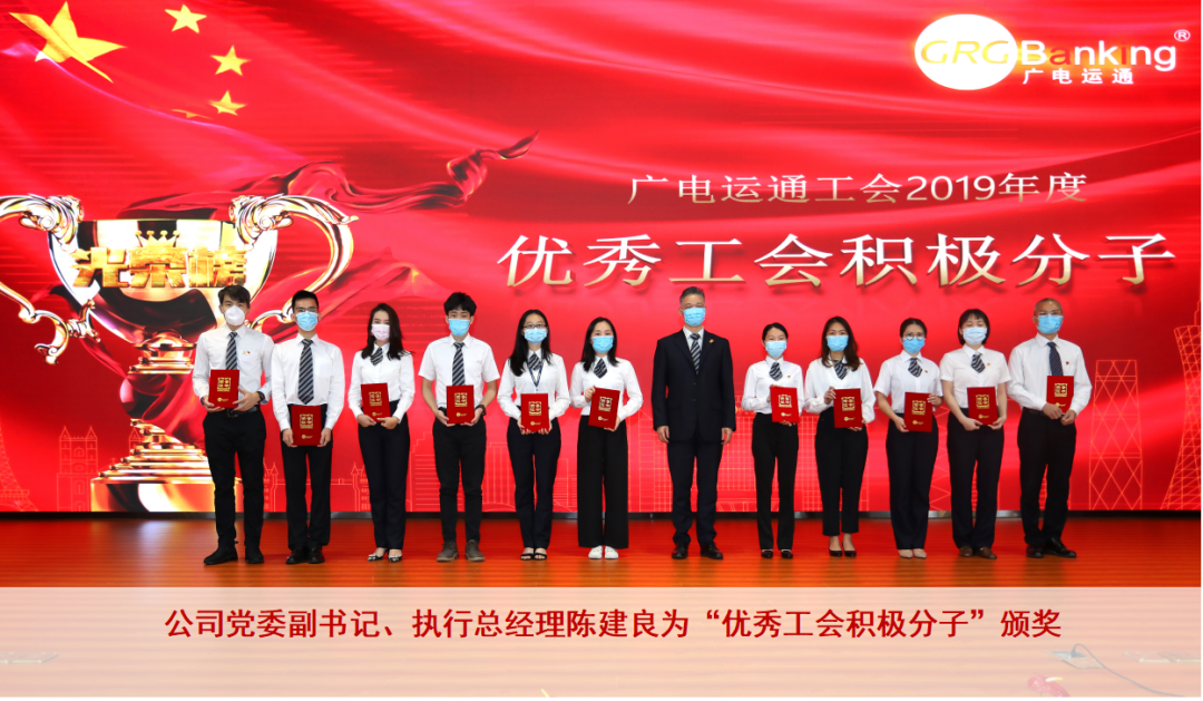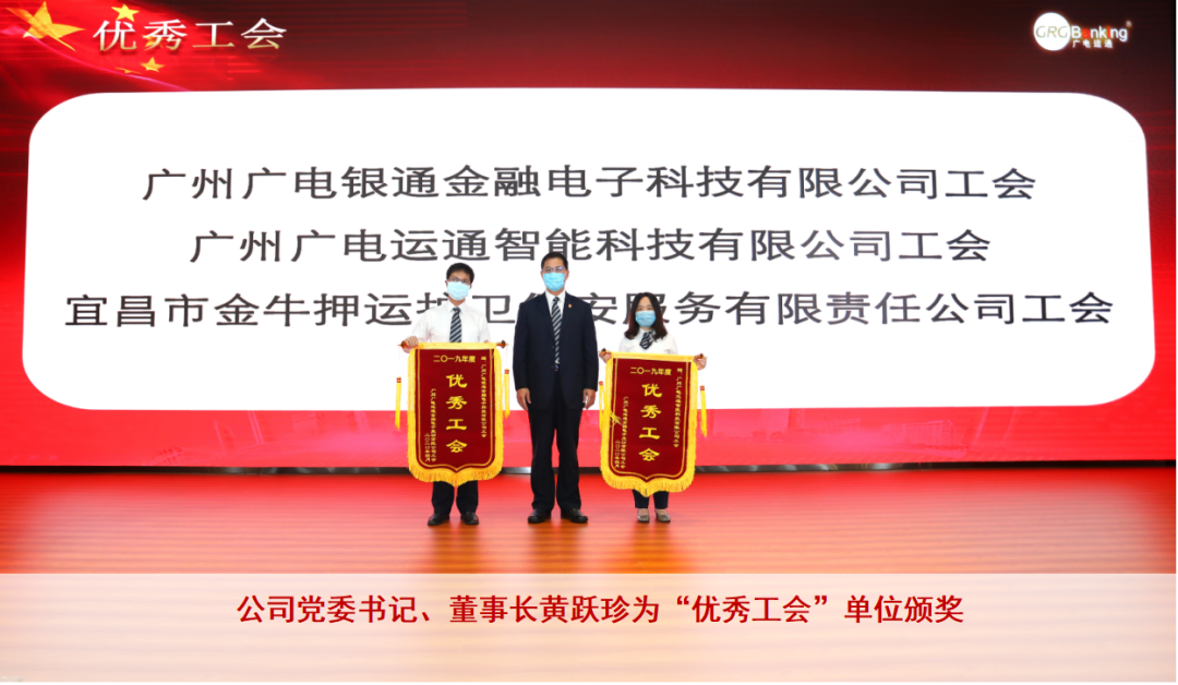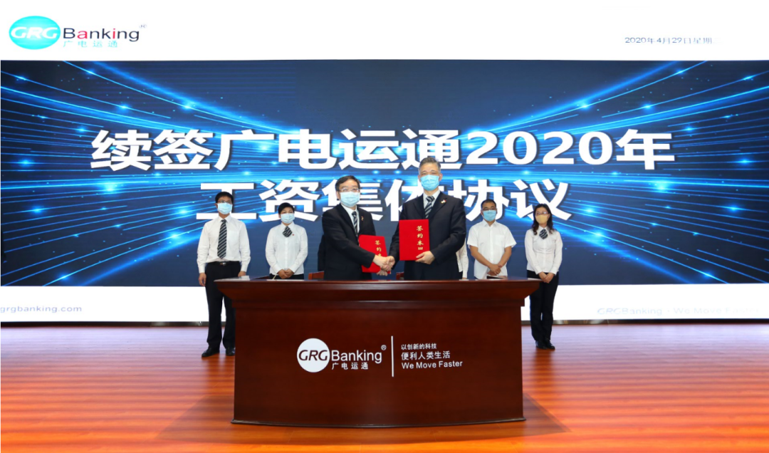 工资集体协议签订仪式为树立典型、激励先进,会上对2019年度的工会先进集体和先进个人进行了表彰。广州广电银通金融电子科技有限公司工会、广州广电运通智能科技有限公司工会、宜昌市金牛押运护卫保安服务有限责任公司工会荣获“优秀工会奖”;黄晓彬、王佳、王蛟、肖阳姬、李淑丽等25人获“优秀工会干部奖”;黄天港、陈送贤、赖俊均、卞亦文、陈晓华等22人获“优秀工会积极分子奖”。结合当前疫情防控要求,会议精简了颁奖流程,部分代表上台接受表彰。