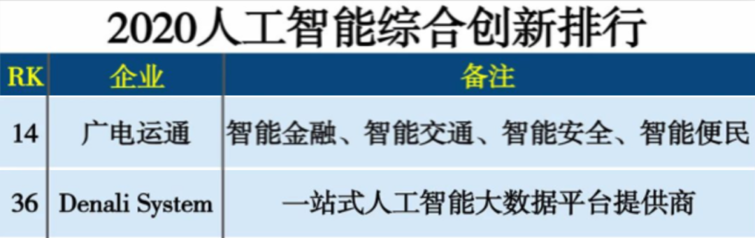 近年来,中国人工智能产业持续保持蓬勃发展态势,并跻身全球人工智能第一梯队。“2020人工智能综合排行”以企业综合创新力为评判依托,选出一批在计算机视觉、自然语言处理、语音识别等核心技术领域及人工智能生态布局方面表现突出的代表性企业,广电运通及旗下Denali System皆榜上有名。