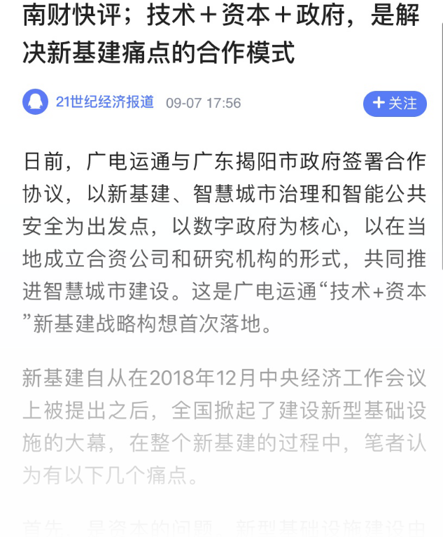 广电运通的“技术+资本”结合“政府”的合作模式,恰可以有助于解决新基建的上述三点痛点。