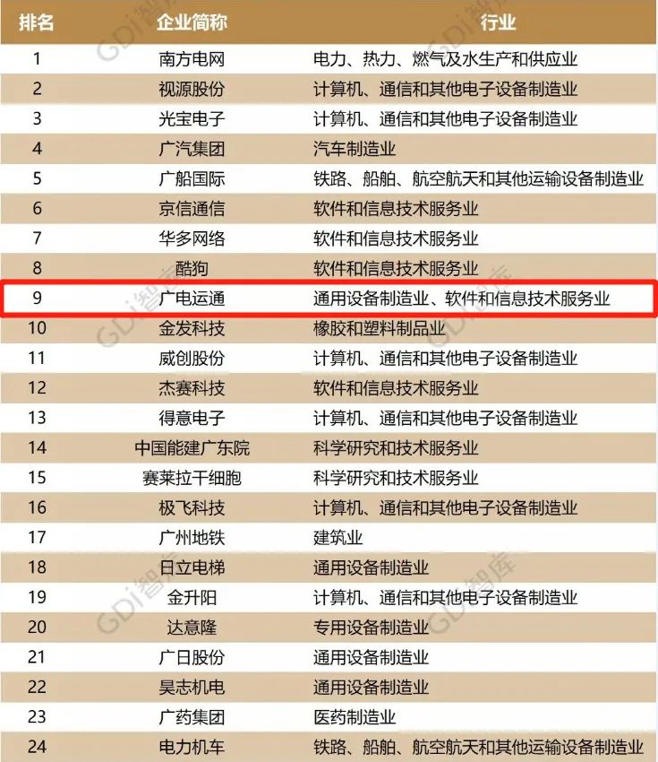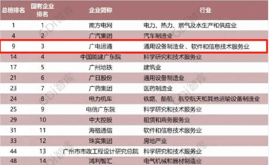 本次备选企业名单来源于近五年国家、广东省以及广州市知识产权优势示范企业名录、知识产权保护重点企业名录、高新企业协会会员名录等。上榜企业中共有43家属于新兴产业,覆盖先进制造产业、新一代信息技术产业、生物产业、新能源产业、节能环保产业、新材料产业和高端装备制造业七大产业。作为软件和信息技术服务业、通用设备制造业的先锋企业,广电运通成功入选榜单,位列总榜单第9位,在国有企业中排名第3位。