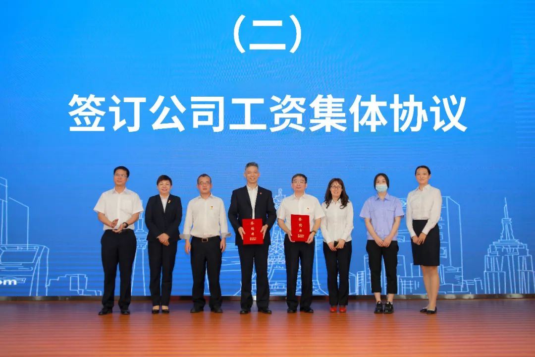 会议举行了2021年工资集体协议签订仪式。企业方代表陈建良和职工方代表谢臣在全体职工代表的见证下,现场签订了协议。
