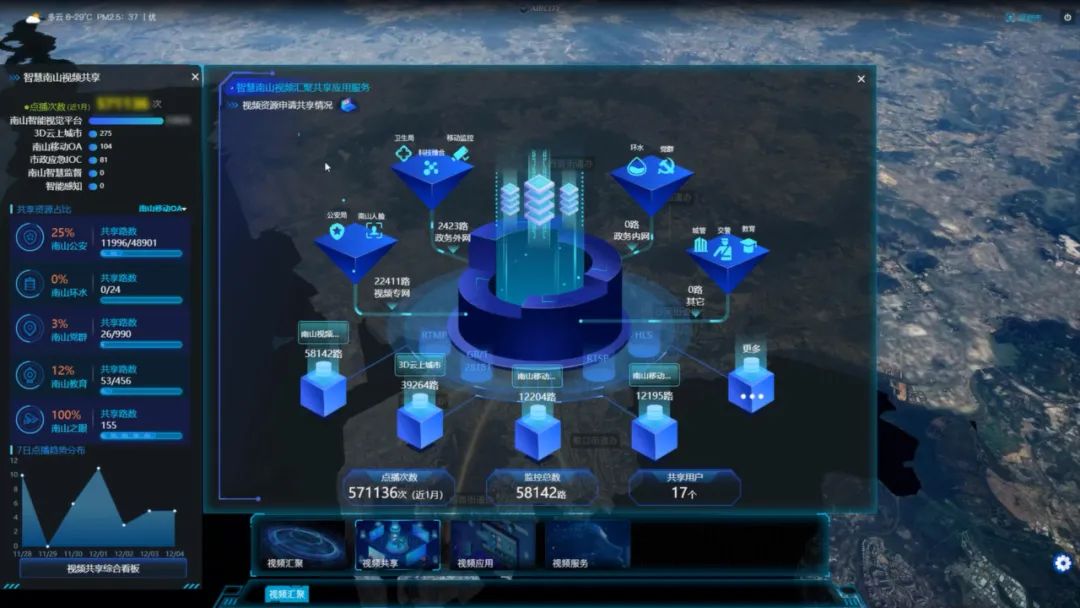 平台自上线以来,实现对深圳南山区一类、二类和三类监控视频进行综合管理和综合应用,并对接市级政务外网。截止目前,平台共汇聚全区视频资源近6万路,其中在线超5万路,总体在线率86.5%,涉及21个视频资源类应用。平台已总计共享18家单位,同市政数局、区政数局、区住建局、区公安局、区教育局、区水务局、区市场监督局、区三防办、区交警大队等十多个局委办业务系统打通,视频共享点播月均接近60万次。