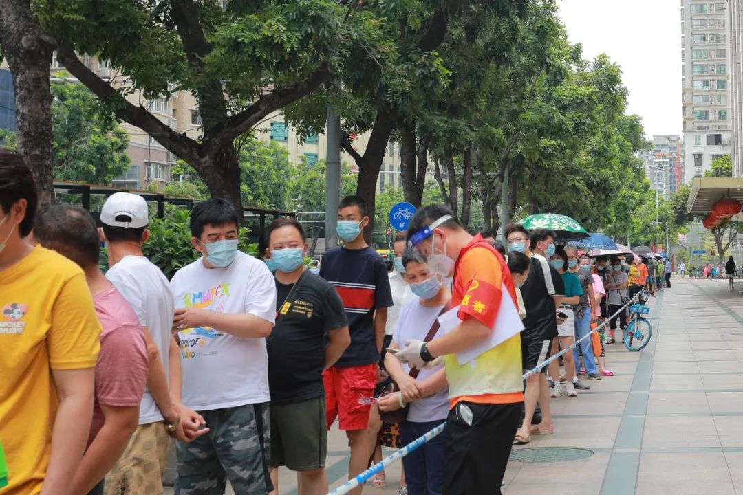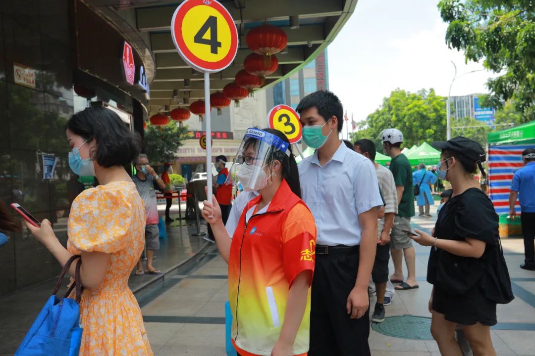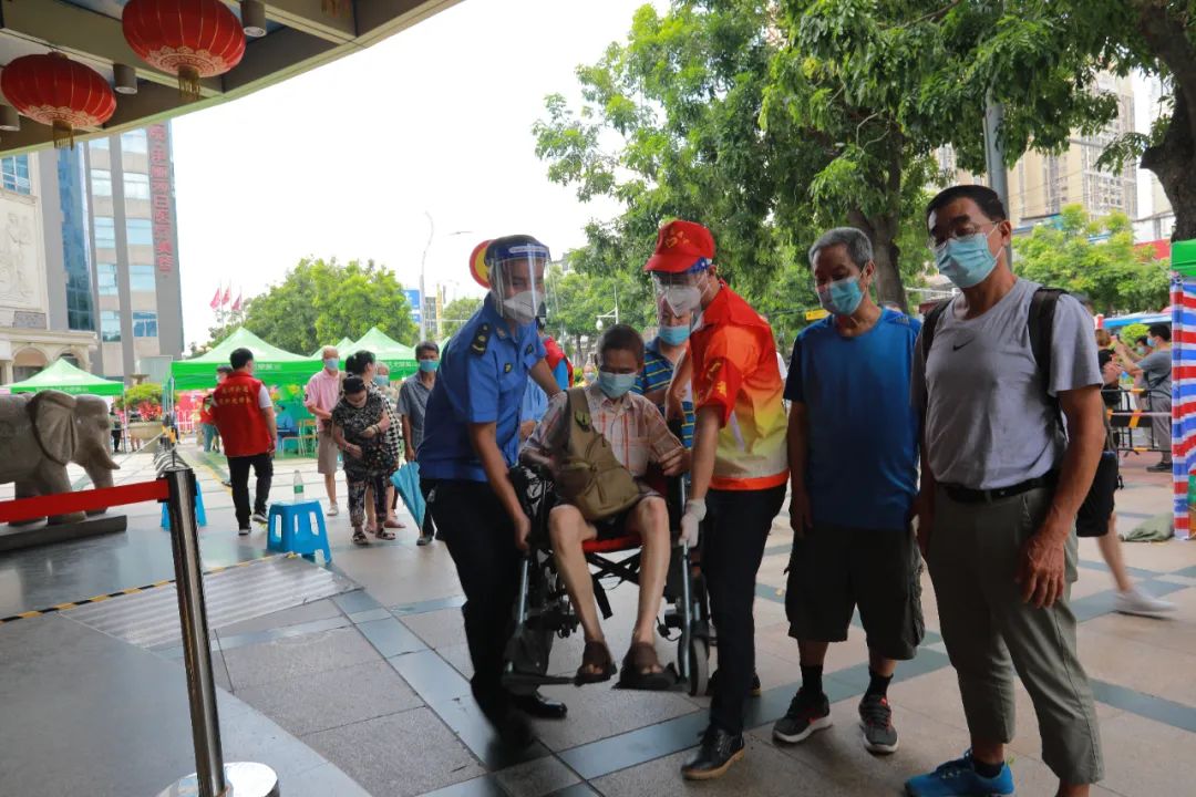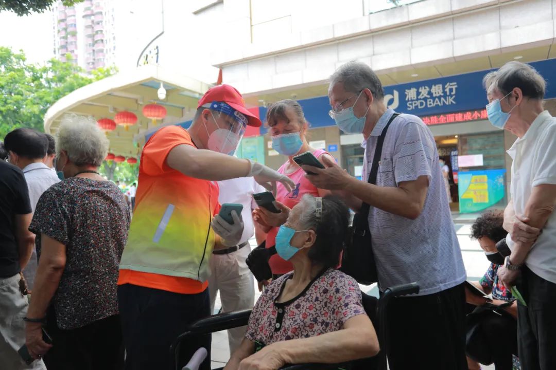 9时50分,广电运通党员志愿者先锋队到达龙津街道,正值核酸检测高峰期,全员根据街道安排,立即开展各项志愿者服务。在烈日下,每当有需要时,总能第一时间看见他们的身影。他们主动帮助行动不便的老人抬轮椅;不懂用手机注册信息时,他们细心帮助注册检测信息;人员密集时,他们主动引导分流,耐心疏导情绪。
