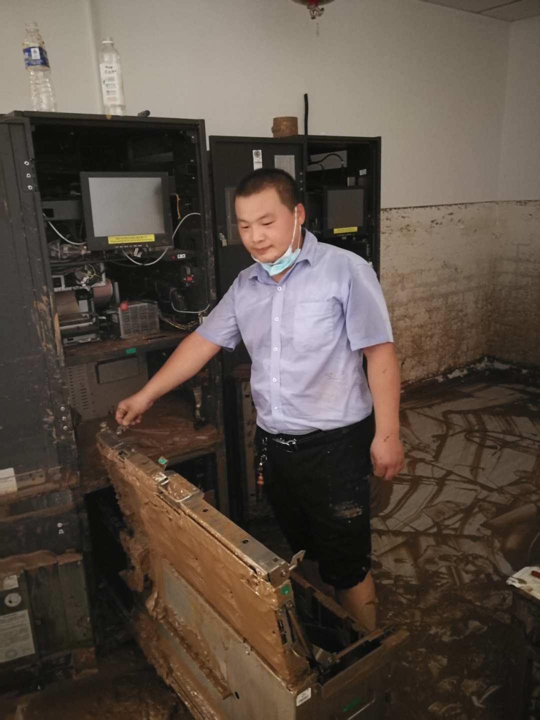 巩义地区服务站主任常高伟在雨停水退后,第一时间与客户取得联系,了解情况后主动提供帮助。当时的巩义,所有公交停运、道路不畅,高伟在确保安全的情况下,搭乘老乡三轮车,辗转多次方抵达现场。手拿铁锹、赤脚上阵,高伟一边帮忙清理室内淤泥,一边根据机器情况和客户进行沟通。虽然腿脚打滑,浑身淤泥,但他超强的行动力却一如既往的让客户安心,得到了行方的高度认可与赞扬。