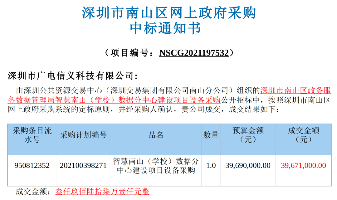 深圳市南山区网上政府采购中标通知书