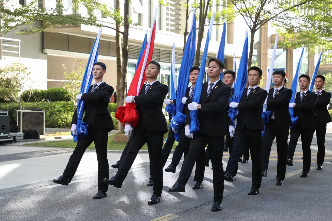 随着主持人宣布升旗仪式正式开始,集团仪仗队昂首阔步、列队前行,将五星红旗、无线电集团与成员企业司旗护送至旗杆下。