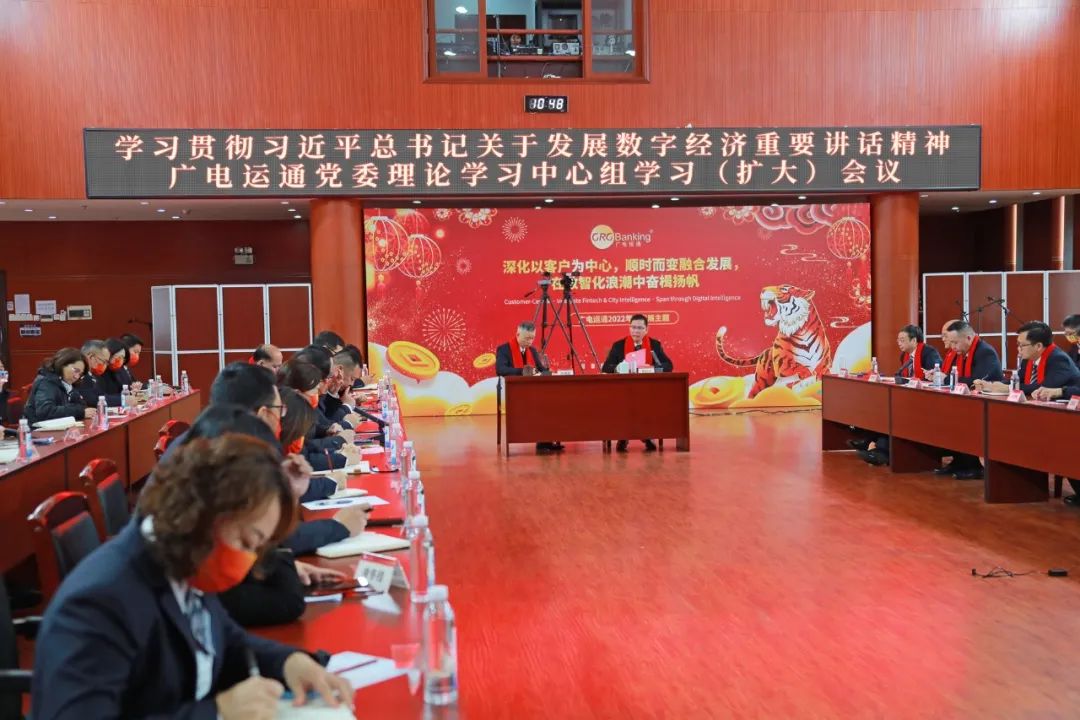 广州无线电集团党委副书记、总经理,广电运通董事长黄跃珍出席会议并讲话,公司党委书记、总经理陈建良主持会议,公司党委副书记、工会主席谢臣传达学习习近平总书记关于发展数字经济的重要讲话精神和省市关于促进数字经济发展的有关文件,公司党委委员、副总经理解永生围绕数字经济发展实践作主题发言,与会人员围绕数字经济与公司融合发展畅谈学习体会,公司党委班子、中层及以上干部、广州市下属子公司总经理现场参会,异地分子公司经营班子通过线上直播形式参加会议。