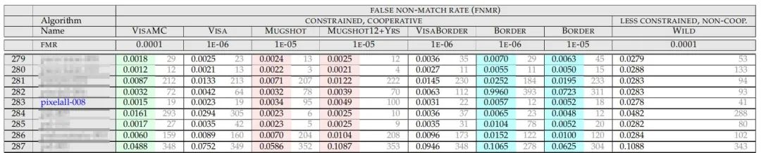 像素数据算法Pixelall-008最高准确率达99.85%,平均准确率达99.29%,位列全球参测算法的前10%。截止目前,像素数据已连续三年7次位列FRVT人脸验证