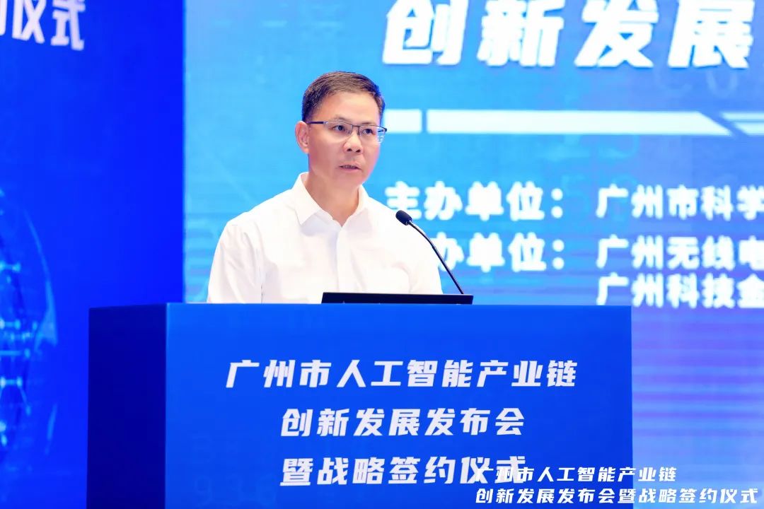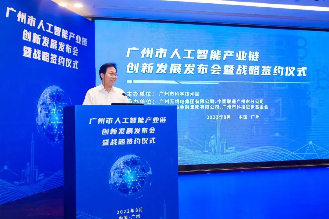 8月8日,由广州市科学技术局主办,广州市人工智能产业链链主企业广州无线电集团有限公司、中国联通广州市分公司、广州科技金融集团有限公司、广州市科技进步基金会承办的广州市人工智能产业链创新发展发布会暨战略签约仪式在广电平云广场顺利举行。广州市科技局二级巡视员刘泉宝,广州无线电集团党委副书记、总经理黄跃珍,广东联通副总经理、广州联通党委书记、总经理闻屏等人工智能产业链相关单位及人工智能领域应用场景典型案例企业代表共同出席了本次活动。