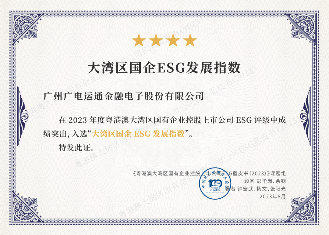 8月11日,2023年度第三届国企社会价值论坛、ESG中国论坛2023大湾区峰会在广州举行。会上发布了“大湾区国企ESG发展指数”榜单,广电运通(002152.SZ)凭借在ESG领域的优秀成绩,成功入选该榜单并获四星评级。