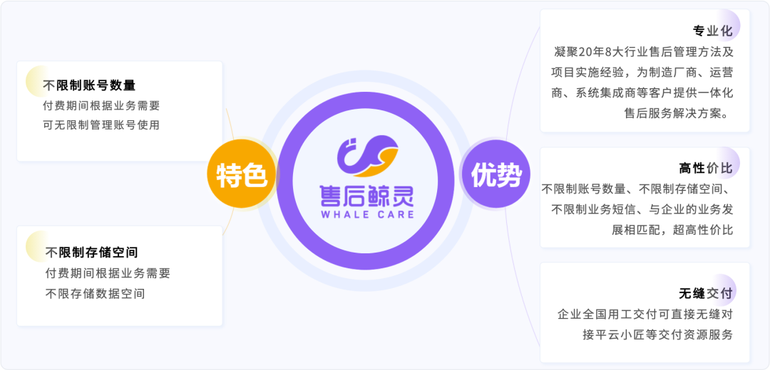 售后鲸灵则把开通账号权限的决定权给回企业本身,不按企业开通账号来收费,针对每个账号的存储空间也作不限制,让企业可以最大限度地进行个性化的灵活管理。