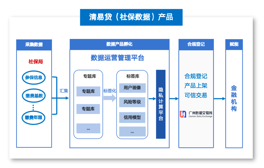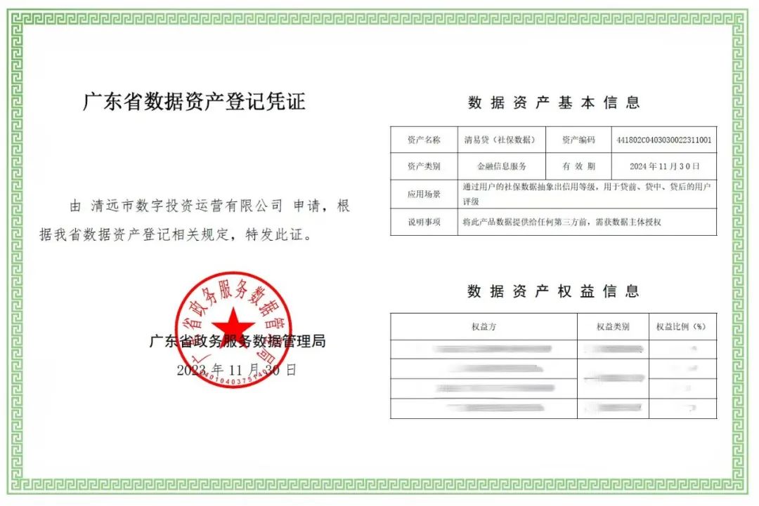 近日,在清远市政务服务数据管理局和广州数据交易所的指导下,由广电运通旗下清远市数字投资运营有限公司(简称:清远数投)牵头,联合联通(广东)产业互联网有限公司共同打造的广东省首个社保领域的公共数据产品“清易贷(社保数据)”已正式通过广东省数据资产合规委员会的合规审核,获广东省政务服务数据管理局颁发《广东省数据资产登记凭证》,在广州数据交易所正式上架交易。