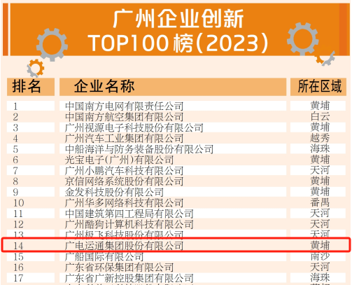 广电运通在广州企业创新TOP100榜(2023)位列第14名