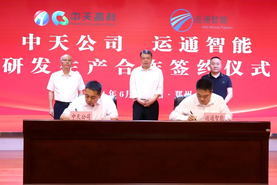 中天公司党委委员、副总经理牛建强与运通智能董事长曾庆宁代表双方签署了研发生产合作协议