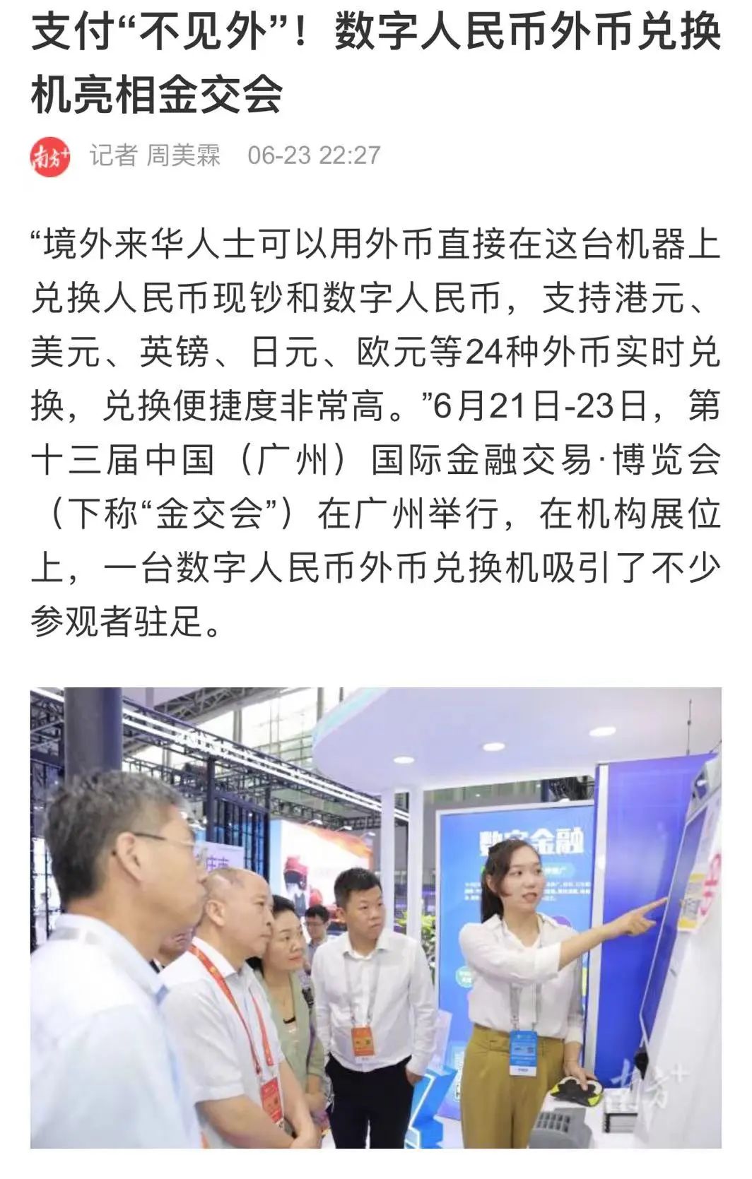“境外来华人士可以用外币直接在这台机器上兑换人民币现钞和数字人民币,支持港元、美元、英镑、日元、欧元等24种外币实时兑换,兑换便捷度非常高。”6月21日-23日,第十三届中国(广州)国际金融交易·博览会(下称“金交会”)在广州举行,在机构展位上,一台数字人民币外币兑换机吸引了不少参观者驻足。