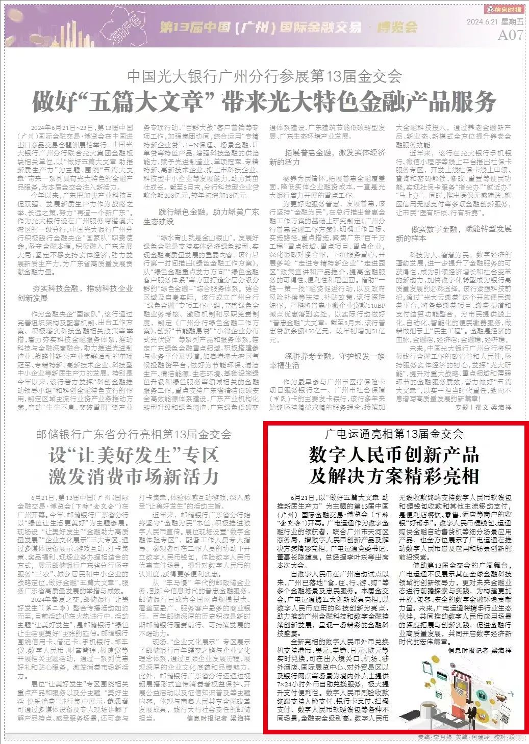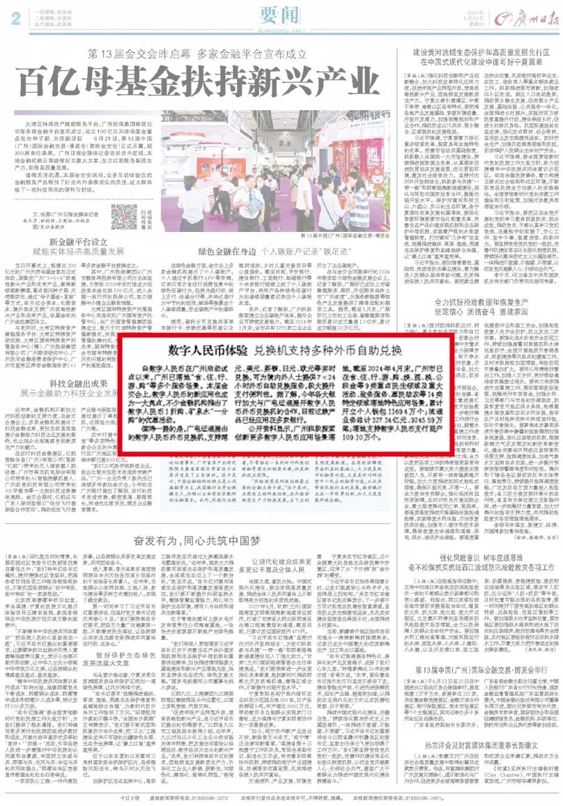 6月21日,广电运通亮相第十三届金交会,展示了其在数字人民币领域的创新产品及解决方案,吸引了包括南方日报、广州日报、信息时报、南方+、21财经等多家媒体的广泛关注与深入报道。以下为部分精选报道内容。