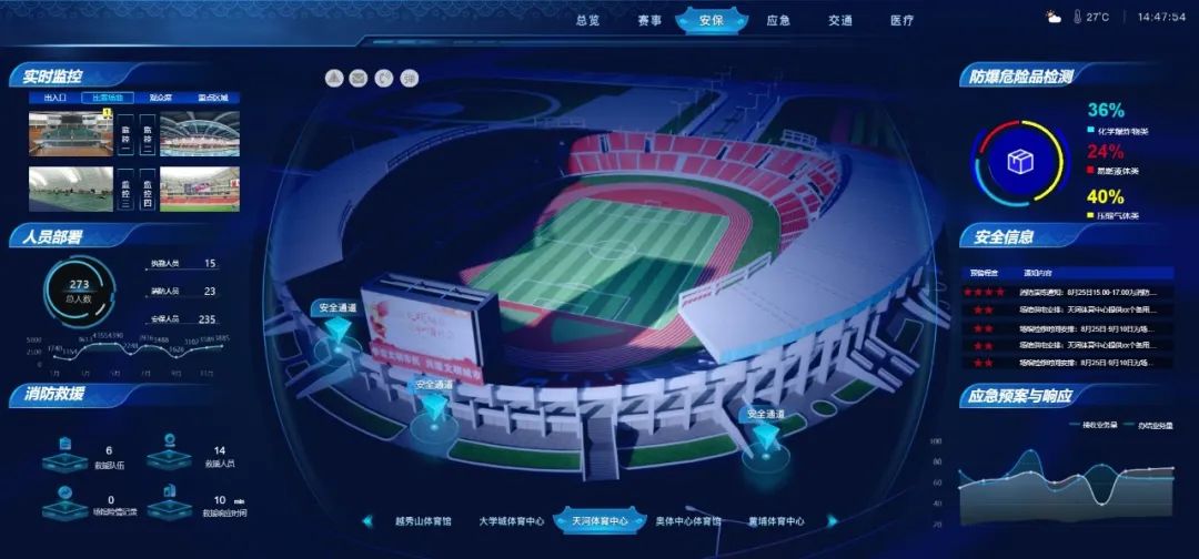 在安全管理方面,依托传统安防综合管理、电子巡查、周界防范、智慧停车等系统,还引入水下监控救生、无人机防御、结构安全监测系统等创新技术。资源管理方面,通过物联网技术对建筑内所有设备进行实时监测,提升建筑能效。赛事服务方面,提供全面的比赛设备及赛事集成管理服务,包括座席导航、出入引导、升降旗、标准时钟、信息显示控制、售检票及票务管理等。赛事创新方面,结合大数据、人工智能技术实现智慧运营管理平台,创新引入AR导览导航、3D视觉通行闸机、AI数字人客服、智慧机器人、岭南特色光影系统等,同时搭建光影互动陪跑墙、全民健身指导系统、无障碍紧急求助系统、无障碍引导系统、无障碍服务桩、无障碍手语翻译、无障碍服务台等,丰富参访体验,确保参赛者和观众都能享受到便捷、安全、舒适的体育盛宴。