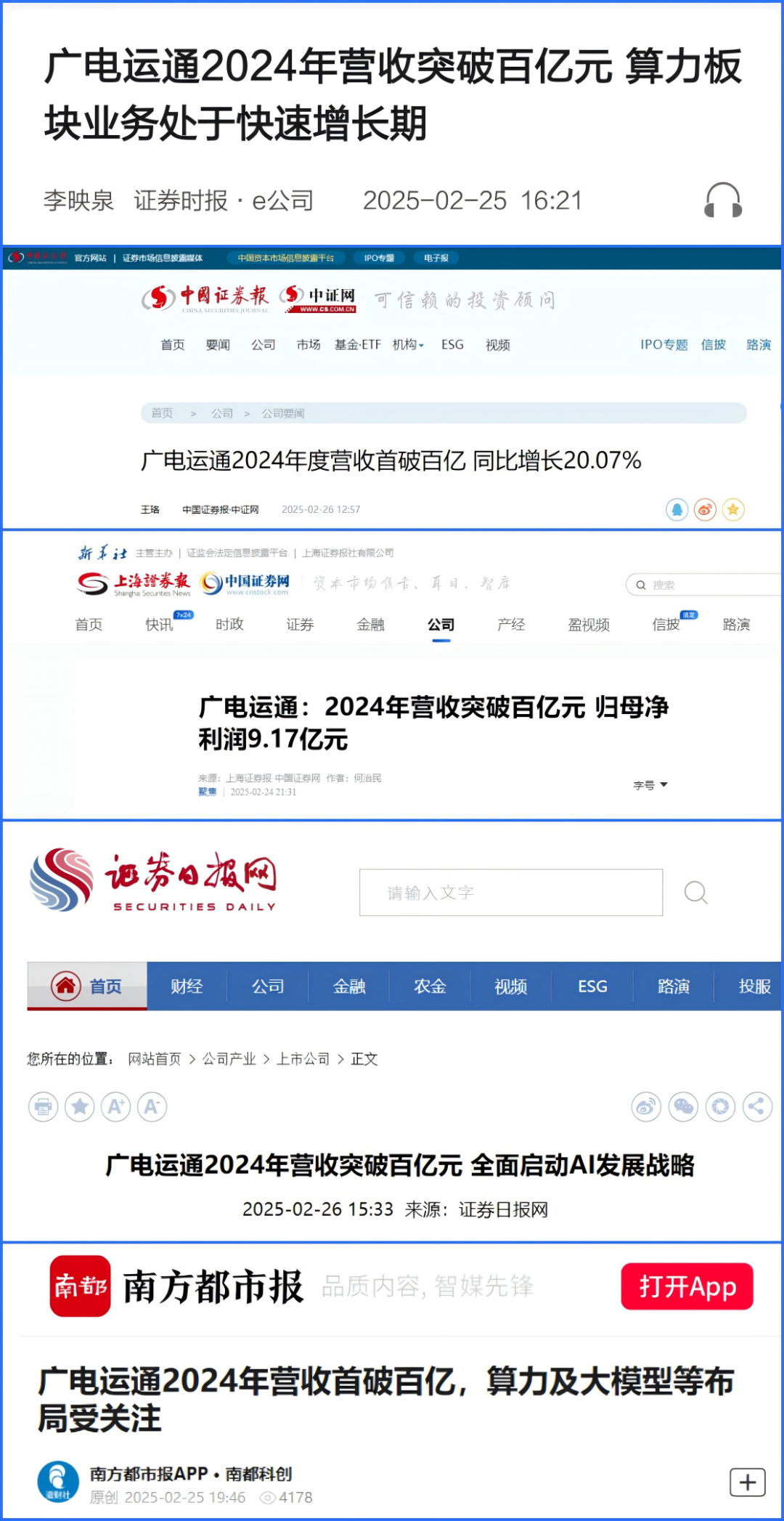 2月25日,广电运通发布业绩快报,2024年度,公司实现营业总收入108.58亿元,同比增长20.07%,年度营收首次突破百亿元。证券时报、中国证券报、上海证券报、证券日报、南都·湾财社等媒体,纷纷关注公司云计算、人工智能、算力产品以及出海业务等布局并进行报道,以下是部分媒体报道摘要。