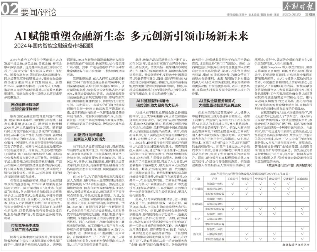3月26日,国内权威媒体《金融时报》发布《AI赋能重塑金融新生态 多元创新引领市场新未来 2024年国内智能金融设备市场回顾》,对过去一年网点运营改革成果进行了回顾,并展望了行业趋势。报告数据显示,广电运通连续17年位列网点智能金融设备市场占有率第一。以下为报告摘要: