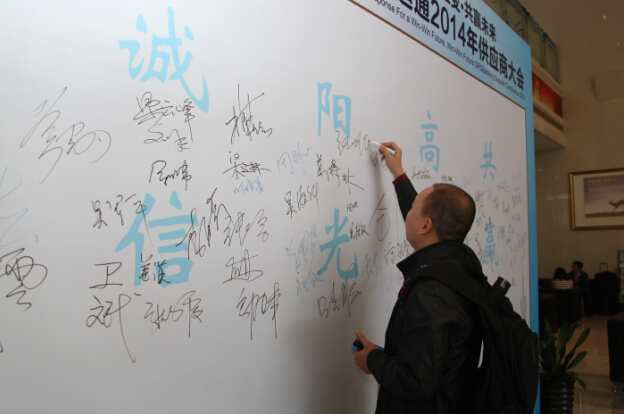 2014年12月18日上午,在广电运通位于广州科学城的产业园内,来自全国各地70多家企业的逾160位企业代表在一面“诚信墙”上签下名字,承诺自己与企业将会坚守诚信交易的原则,用规范化的合作达成共赢。